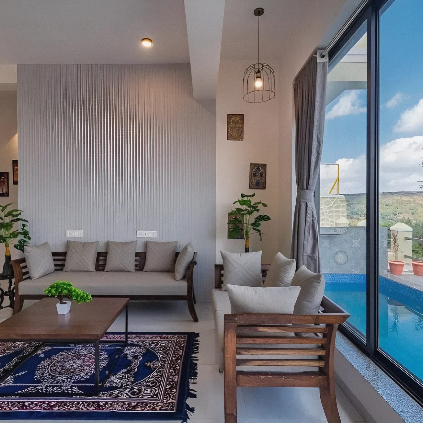 Experience the epitome of luxury in our Luxury 7 BHK Villa in Panchgani with Pool, Mountain & Dam View-Mahabaleshwar Road. Ideal for groups and families, this premium villa features scenic AC bedrooms, a triangle-shaped swimming pool, large dining area with valley views, and an open terrace for gatherings with mesmerizing fog-invaded mountain and dam views. Indulge in amenities like a reception area, water purifier, barbecue facility, table tennis, lawn area, and a yoga spot overlooking the valley. With a caretaker on-site, ample parking, and free Wi-Fi, your safety and comfort are our priorities. Enjoy togetherness in the canopy area, offering a spectacular view of the valley.